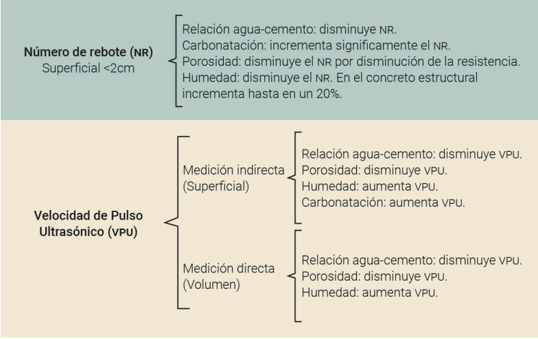 Por otro lado, a pesar de no mencionarse de manera explícita en la norma es posible entrever, a partir de los ensayos propuestos y las propiedades mecánicas a estimar, la posibilidad de hacer uso del método SONREB, el cual correlaciona los valores del número de rebote, la velocidad de pulso ultrasónico y la resistencia a compresión.23 No obstante, el análisis de la factibilidad de uso y aplicabilidad de dicho método a un determinado proyecto deberá ser estudiado a detalle, así como verificar que se cumplan las condiciones y requerimientos necesarios para la correcta obtención de resultados.