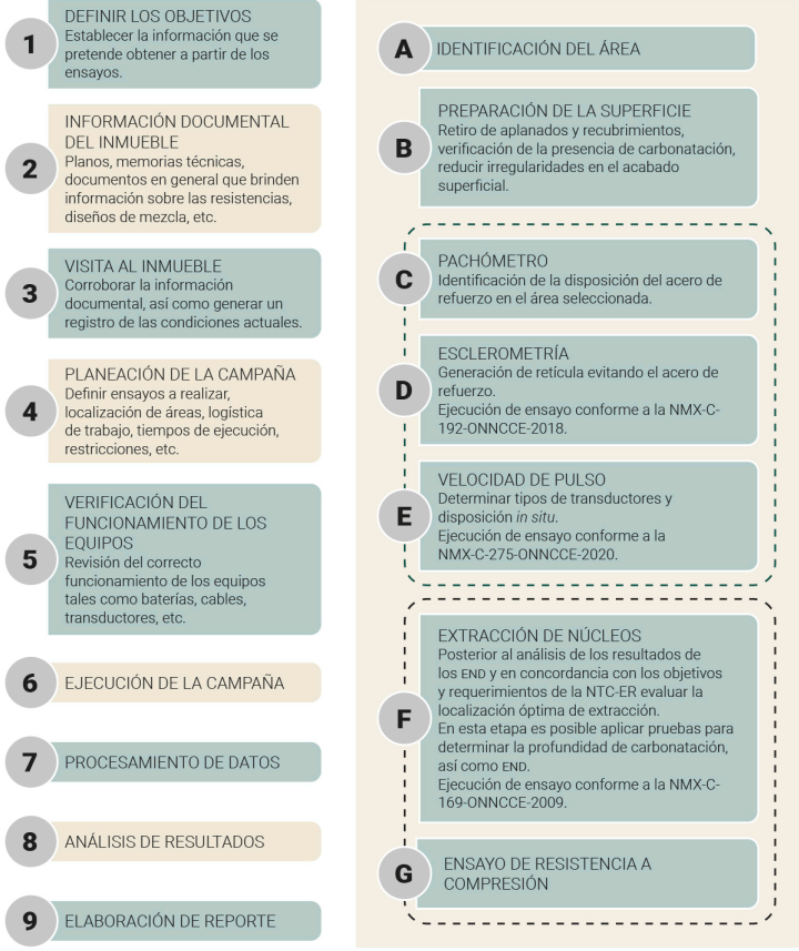 Los retos de la campaña in situ engloba diversos aspectos, los cuales no se limitan al aspecto técnico ya que factores de gestión, accesibilidad a las diversas áreas y las condiciones de seguridad para el personal también se ven involucrados. La importancia que conlleva una adecuada selección del área para la extracción de núcleos dentro del inmueble debe garantizar la representatividad y condiciones óptimas de los especímenes a ensayar. De acuerdo con la NTC-RE la campaña tanto de ensayos destructivos como no destructivos, en caso de requerirse, será planteada por el proyectista, quien deberá considerar los lineamientos especificados dentro de la norma para definir el número y ubicación.21 La campaña de ensayos será autorizada por el Director Responsable de Obra (DRO) y los corresponsables; además, los laboratorios deberán contar con la acreditación y reconocimiento de un organismo acreditado para los métodos de prueba.22