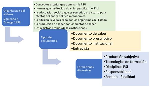 Haciendo una adaptación a lo expuesto por Zuluaga (1999), dicho saber está regido por unas reglas que direccionan las prácticas discursivas y que involucran la institución, el sujeto y el discurso mismo de la RSU, que se encuentra disperso en diversos registros discursivos y que, para efectos del presente estudio están agrupados de la siguiente manera: conceptos propios que dominan la RSU; normas que institucionalizan las prácticas de RSU; la adecuación social a que es sometido el discurso para efectos del poder político o económico; la difusión llevada a cabo por los organismos del Estado; la producción de saber por los sujetos de saber y los registros propios de las instituciones. Cumplido con este proceso se clasificó dichos documentos a nivel de: saber, aquellos que son prescriptivos frente al deber ser de la RSU, los institucionales y un conjunto de entrevistas, las cuales permitieron dar cuenta de los procesos de subjetivación.