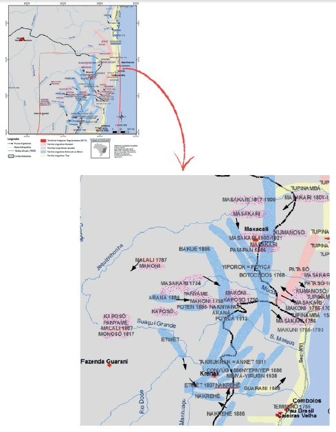 A Figura 1 traz um mapa, elaborado a partir dos estudos etno-históricos promovidos por Curt Nimuendaju, no início da década de 1940, nos fornece uma ideia mais clara dos fluxos migratórios de alguns povos originários que circularam ao Sul da Bahia, Norte do Espírito Santo e Leste de Minas Gerais, dentre eles, os Krenak representados em azul. Pode-se observar que os levantamentos feitos por Nimuendaju mostram deslocamentos de Botocudo, ancestrais dos Krenak, desde 1718 nos vales dos rios Mucuri, São Mateus, Suaçuí Grande, Manhuaçu e Doce. Mais especificamente onde hoje se localiza o território Krenak, o estudo identificou alguns grupos, também considerados de origem Botocudo, desde o início do século xix até as primeiras décadas do século xx, como os Takrukrak, Convug, Nyepnyep, Minya-Yirugn, Etwet e Nakrehê.23