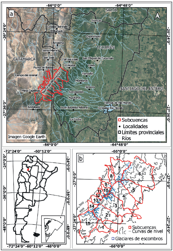 El área de estudio se encuentra en las cumbres de la sierra del Aconquija, abarcando los sectores más elevados de las cuencas ubicadas en las laderas orientales, occidentales y sur. Esta sierra que se extiende en dirección NE-SW, según se muestra en la Figura 1.a, se encuentra ubicada aproximadamente entre las latitudes 26° 41’13” y 27° 41’31” sur. Es la elevación más prominente de la provincia de Tucumán y límite tanto político como natural con la provincia de Catamarca. Su extremo septentrional es el Abra del Infiernillo y el Alto del Rumiarco, con una altitud de 3039 msnm. Hacia el sur, se encuentran las altas cumbres del Cerro Muñoz, que superan los 4000 msnm (Alderete, 1998). La Sierra presenta un marcado relieve topográfico, alcanzando su punto más elevado en el cerro El Bolsón, con una altitud de 5552 msnm, mientras que su punto más bajo se encuentra en la transición entre el piedemonte inferior y la llanura, a una altitud de 400 msnm.