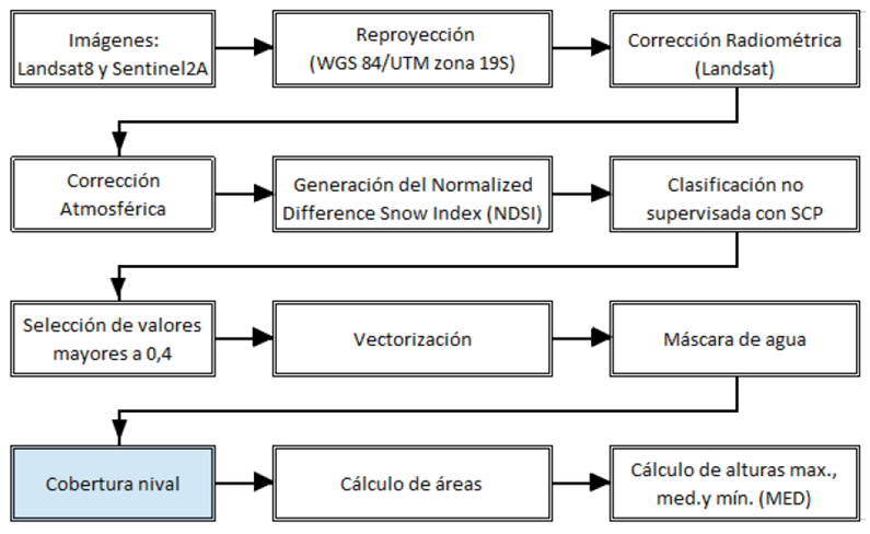 Con los datos obtenidos en el procedimiento anterior, y el propósito de determinar las máximas coberturas de nieve relacionadas a las fechas de las observaciones realizadas sobre las imágenes Landsat 8 y Sentinel 2A, se procesó el producto de nieve MOD10A2 del sensor MODIS. Este producto, de nivel 3, estima la extensión máxima de la cubierta de nieve de ochodías (Hall et al., 2001; 2006), con una resolución espacial de 500 metros y temporal de dos días. Cada píxel indica de manera cualitativa la presencia o ausencia de nieve, registrada al menos en uno de los ocho días considerados. Se procesó el archivo “Maximum Snow Extent” del producto MOD10A2, disponible en formato de archivo multiobjeto.hdf (formato de datos jerárquicos), que contiene datos y metadatos. Los archivos se convirtieron a formato GeoTIFF con el software Hdf-Eos to GIS Conversion Tool (HEG) descargado de https://hdfeos.org/software/heg.php, para ser procesados de forma similar al diagrama de flujo de la Figura 2, el cual se resume de la siguiente manera: Reproyección (WGS 84/UTM zona 19S)-21:54 9/7/2024 Clasificación no supervisada -Vectorización-Máscara de agua-Cálculo de áreas-Cálculo de alturas máximas, medias y mínimas.