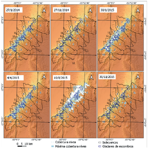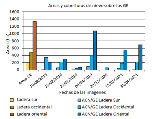 En la Tabla 3 se muestran las áreas que ocupan los glaciares de escombros en las laderas de la sierra, así como los sectores de estas que fueron cubiertos por eventos de nieve. La elaboración de la Tabla 3 se basó en la selección de siete fechas específicas, elegidas en función de extensión superficial y distribución espacial de las coberturas níveas.