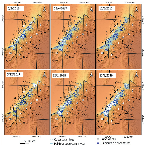Mediante el procesamiento de los datos del producto de nieve MOD10A2 del sensor MODIS, se pudo determinar la extensión máxima de las cubiertas de nieve en períodos de 8 días. Estos períodos se seleccionaron en función de las fechas de las imágenes capturadas por los satélites Landsat 8 y Sentinel 2A.