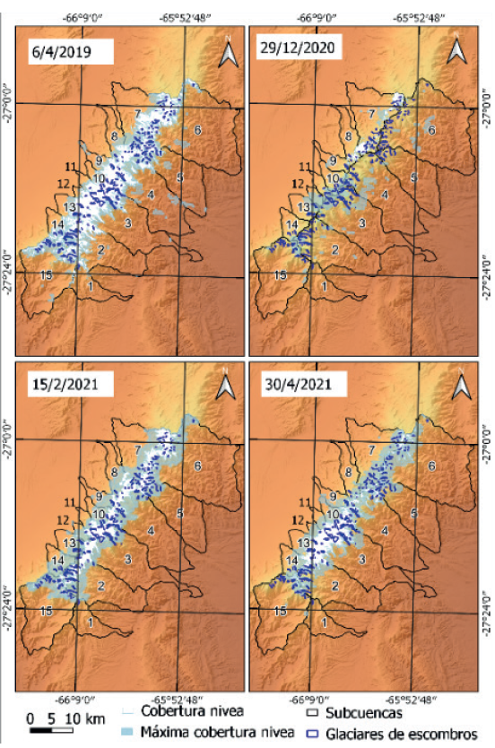 Este estudio se centró en analizar la extensión de la cobertura de nieve y su relación espacial con los glaciares de escombros, con el objetivo de determinar hasta qué punto las precipitaciones níveas influyen en la preservación de estas geoformas. Aunque el período bajo consideración (2014-2021) no abarca un lapso extenso, el análisis realizado permitió obtener información preliminar de la cobertura nival en la sierra del Aconquija.