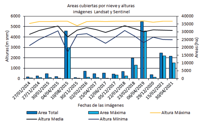 Tabla 2 Fechas, áreas (ha) y alturas (msnm) de las coberturas níveas obtenidas de las imágenes Landsat 8 y Sentinel 2A