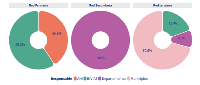 Para 2022, Colombia tiene una red vial estimada “de 205.745 km de carretera, de los cuales el 9% (18.323 km) corresponde a la red primaria, 22% (45.137 km) a la red vial secundaria y el 69% (142.284 km) pertenece a vías terciarias” (Mintransporte, 2022, p. 29). Como se muestra en la Figura 1, de los 18.323 km de red primaria a cargo de la nación, el 59% (10.840 km) es administrado por el Instituto Nacional de Vías (INVÍAS) y el 41% (7.484 km) es administrado por la Agencia Nacional de Infraestructura (ANI), bajo contratos de concesión. La red secundaria se encuentra en su totalidad bajo administración departamental y de los 142.284 km de red terciaria, “el 71% (100.748 km) es administrado por los municipios, 10% (3.959 km) se encuentran bajo administración departamental y el 19% (27.577 km) es administrado por la nación a través del INVIAS” (Mintransporte, 2022, p. 29). Estimaciones presentadas por el Departamento Nacional de Planeación (DNP) indican que “el 70% de las vías terciarias son en afirmado, el 24% en tierra, y el 6% están pavimentadas, y en promedio, solamente el 19% se encuentra en buen estado, el 41% en regular y el 40% en mal estado” (DNP, 2023, p. 4).