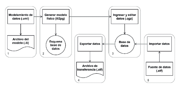 La metodología se divide en cinco fases, como se muestra en la Figura 2. En la primera fase se realiza el modelado de datos con la herramienta UML/INTERLIS-Editor. Se define el nombre del modelo y se adicionan cada una de las clases, se listan los atributos sin caracteres especiales, espacios o tildes y los tipos de atributos (numérico, texto, fecha, geometría), se establecen las cardinalidades de los atributos que pueden ser de tipo obligatorio, opcional, multivaluado, multivaluado pero con al menos un valor en ese atributo, se crean los dominios como un rango de valores específicos para la definición de un atributo, se diligencian las descripciones de cada clase para comprender a que se refiere cada uno de los campos incluidos. Se adicionan las relaciones entre cada una de las clases, la definición de los roles y sus cardinalidades. El diagrama de clases en el lenguaje unificado de modelado (UML, por sus siglas en inglés) se mejora visualmente, aplicando color a las clases para identificar cada paquete del modelo. La herramienta valida que la sintaxis del modelo sea correcta y si no arroja errores, se exporta a un archivo de modelo de INTERLIS con extensión .ILI.