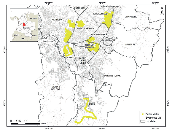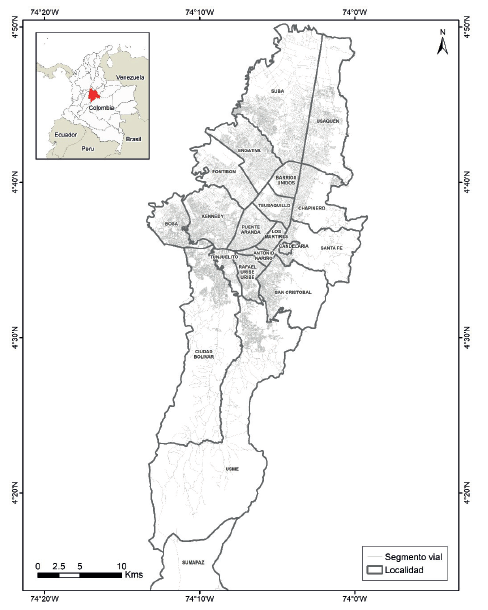 El área de estudio donde fue aplicado el modelo extendido es la ciudad de Bogotá, capital de Colombia que se encuentra ubicada en el centro del país sobre la cordillera oriental de los Andes. Bogotá presenta una división administrativa de 20 localidades como se observa en la Figura 3, de las cuales 19 están ubicadas en suelo urbano y una en suelo rural para gestionar de forma adecuada las redes de servicios públicos como la infraestructura vial. Los datos del inventario vial y la evaluación de los pavimentos de algunas localidades de Bogotá provienen del sistema de mapeo móvil, un prototipo para entornos viales compuesto de hardware, que incluye la cámara de alta resolución espacial y el sistema de posicionamiento en tiempo real, y software que incluye el análisis de las imágenes capturadas y la conexión con el sistema de posicionamiento, en el que se adquiere información de las fallas identificadas sobre la vía como grieta, piel de cocodrilo, protuberancia o bache para que sean estructurados en el modelo.