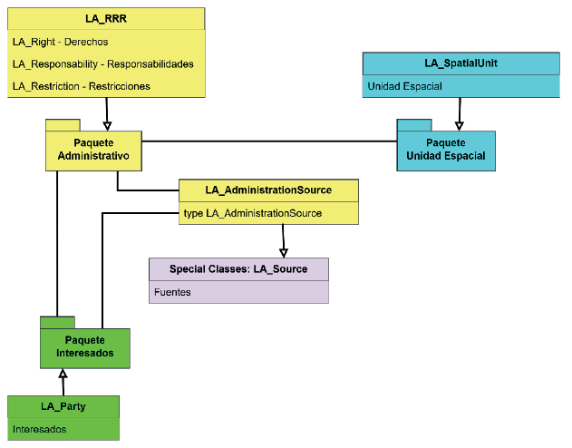 De esta manera, LADM se presenta como un modelo conceptual organizado en tres paquetes principales y un sub-paquete. Los paquetes principales son: i) Interesado ii) Administrativo y iii) Unidad Espacial. El sub-paquete corresponde a mediciones y topografía. Lo anterior permite que mediante cuatro clases principales (Interesado, Derecho-Restricción-Responsabilidad (RRR, por sus siglas en inglés), Unidad Administrativa Básica y Unidad Espacial) pueda brindarse información de cada objeto territorial de acuerdo con las relaciones que existen entre esos objetos y las personas, a través de un derecho, una responsabilidad o una restricción (Instituto Geográfico Agustín Codazzi [IGAC] 2018).