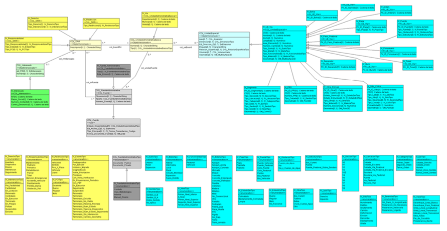 En las clases de restricciones, derechos y responsabilidades, se gestionan las relaciones de la persona jurídica con el objeto territorial Vía, como se observa en la Figura 5 de color amarillo. Las restricciones de tránsito en la Vía, están dadas según el día de la semana, la hora, el tipo de automóvil, la terminación de su placa, el límite de velocidad y el cierre parcial o total. En derechos, el modelo se enfoca en un programa de conservación de la malla vial que permite la organización de actividades como inventario, diagnóstico, diseño, intervención y seguimiento. Las responsabilidades, se atribuyen a mantenimientos de tipo rutinario o periódico, rehabilitación de tipo parcial o total y atención a emergencias de tipo accidente vehicular, deslizamiento, pérdida de la banca y obstáculo vial. Otra clase fundamental en el paquete es la fuente administrativa, dado que permite soportar la relación entre la persona jurídica y la vía, de acuerdo con los trabajos adelantados durante todas las etapas de la administración vial en diseño, programación, construcción y operación. Esta clase se establece para la inclusión de documentos tanto públicos como privados que están relacionados con resoluciones, contratos, manuales de diseño, guías metodológicas o informes técnicos, como se observa en la Figura 5 de color gris.