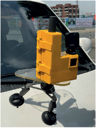El modelo conceptual que se ilustra en su totalidad en la Figura 5 se convierte en un modelo físico con el motor de base de datos PostgreSQL y la extensión para datos espaciales PostGIS. La información que ingresa en la base de datos proviene de las misiones en campo realizadas con el sistema de mapeo móvil que se observa en la Figura 6, un prototipo con cámara y GPS de bajo costo y alta precisión, que se instala en la parte frontal de un vehículo y graba todo el recorrido, para realizar inventarios viales y evaluar el tipo de pavimento, el espacio público, la clase, la severidad y la extensión de los daños presentes en la Vía analizada. El procesamiento de los datos capturados con el sistema de mapeo móvil, arroja los fotogramas del video donde se identifica algún daño y encierra la extensión del mismo en un cuadro de color azul.