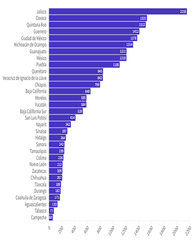 En la Figura 2, se presentan los resultados de las unidades económicas con operaciones de comercio al por menor en el sector de artesanías, claramente se observa el liderazgo del estado de Jalisco con 2,155 establecimientos que representan el 10.21% del total, seguido de Oaxaca con 1,531 unidades económicas correspondiente al 7.25% y Quintana Roo con 1,512 representando el 7.16%. La menor participación se ubica en el sur de México, Campeche con 60 establecimientos 0.28%, Tabasco 0.36% y Aguascalientes 0.63%.