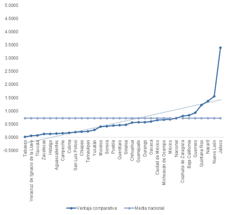 Finalmente, el resultado de la competitividad relativa indica que Baja California, Jalisco y Nuevo León tienen el mejor resultado, mientras que la menor ventaja relativa se visualiza en Tlaxcala, Veracruz y Tabasco.