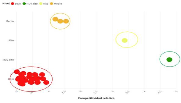 Finalmente, en la Figura 5, se visualiza el mapeo del nivel de competitividad comparativa de las entidades federativas, se observa que solamente Baja California Sur presenta un nivel muy alto, Jalisco alto y tres estados Nayarit, Nuevo León y Quintana Roo en nivel medio, el resto de las entidades federativas en nivel bajo de competitividad comparativa.