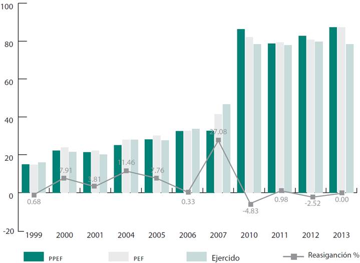 En la Gráfica 1 se puede observar que desde 1999 la labor de la Cámara de Diputados en materia presupuestaria ha sido más activa. Al ejercer su facultad exclusiva de modificar el presupuesto, ha realizado reasignaciones a la iniciativa del Ejecutivo en el gasto del Ramo 20 durante todo el periodo de estudio excepto 2013, año en que regresó el PRI al gobierno federal y obtuvo mayoría relativa en el Congreso. La mayoría de las reasignaciones significaron montos superiores a los presentados por el Ejecutivo; de hecho solo se presentaron tres enmiendas dirigidas a disminuir el gasto de la iniciativa durante el periodo 1999-2013. Por ejemplo, en 1999 el Ejecutivo federal propuso un gasto neto total de 14 915 millones de pesos (mdp) constantes, y la Cámara de Diputados autorizó 14 814 mdp.