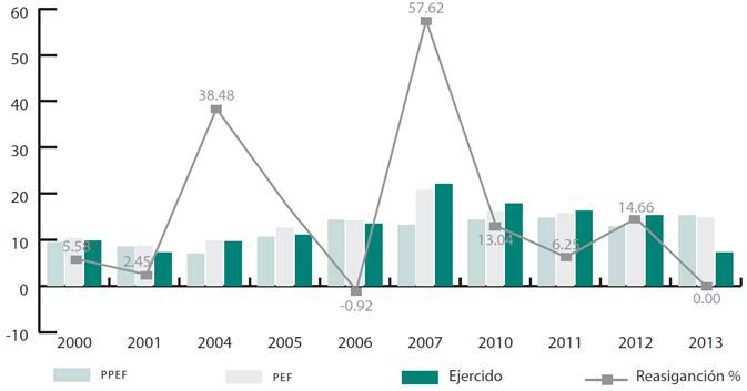 Nota: «Reasignación %» indica la variación porcentual del PEF respecto al PPEF. Solo se presenta la información correspondiente a los años en torno a las elecciones presidenciales y el año en cuestión. Debido a la disponibilidad de información, se consideró solo un año previo a los comicios de 2000 y dos años antes de las elecciones de 2006 y 2012. Fuente: Elaboración propia con datos de la SHCP (2017).