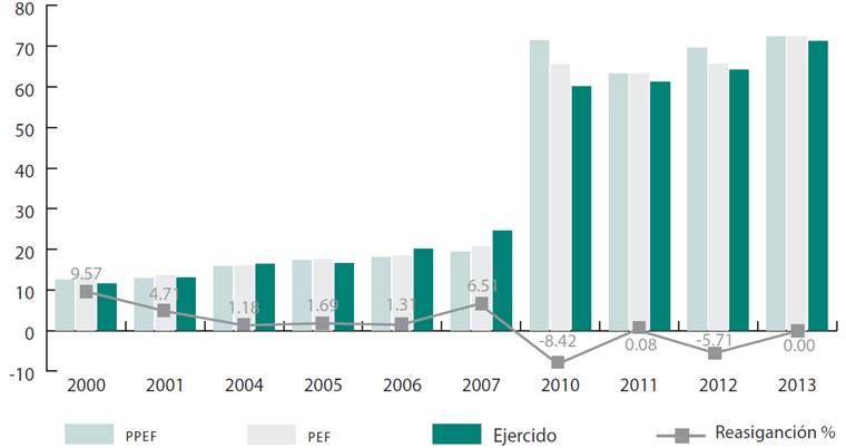 De igual manera, resalta la reasignación de 2012 en el sentido de que el presupuesto aprobado sufrió una disminución en año electoral, lo cual sugiere que la composición de la Cámara de Diputados y los incentivos de los legisladores influyeron en el volumen del gasto autorizado, ya que el partido del Ejecutivo tenía la segunda minoría en el Congreso pues contaba con solo 28 % de las curules. Además, se señala que algunas acciones de Felipe Calderón dificultaron la construcción de alianzas con los partidos de oposición.18