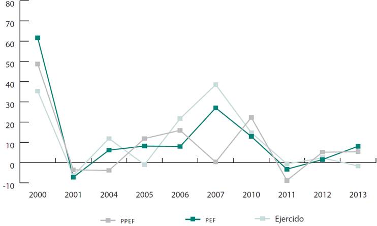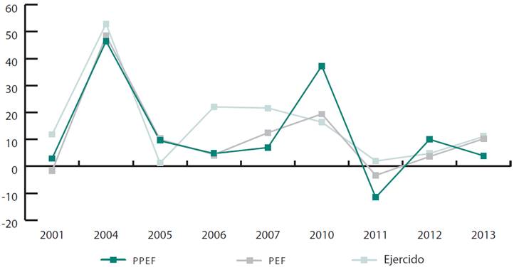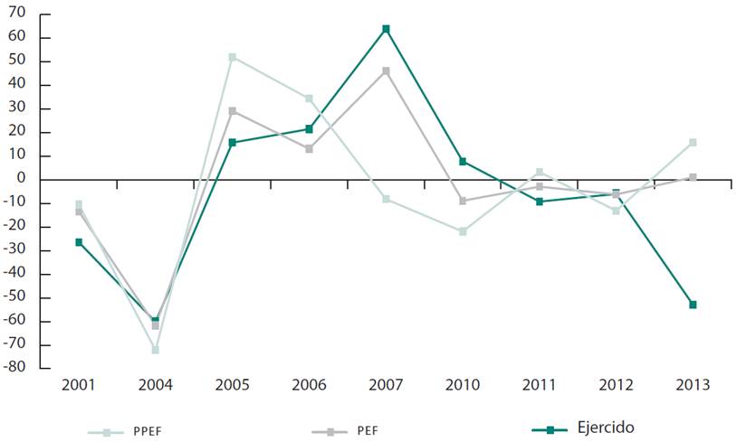 En años posteriores a los comicios federales se observa en el PPEF de 2001 una tasa de crecimiento negativa de 3.5 %, que se puede atribuir al programa de estabilización de la recesión iniciada en ese año, lo cual no se explica directamente por el ajuste fiscal poselectoral (Mejía et al., 2017). Por el contrario, para 2007 y 2013 se tuvieron tasas de crecimiento de 0.3 % y 5.4%, respectivamente.