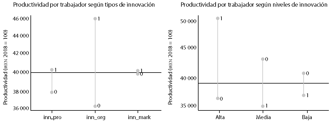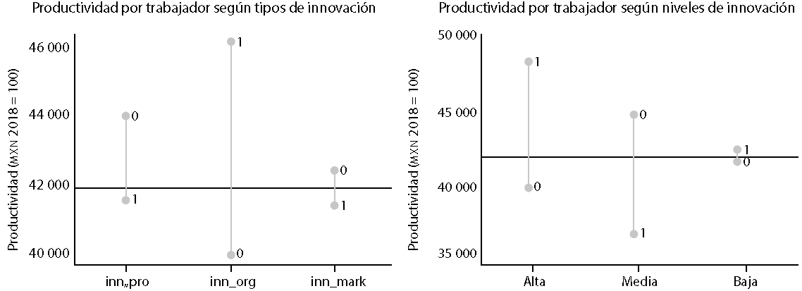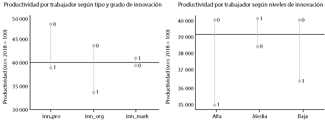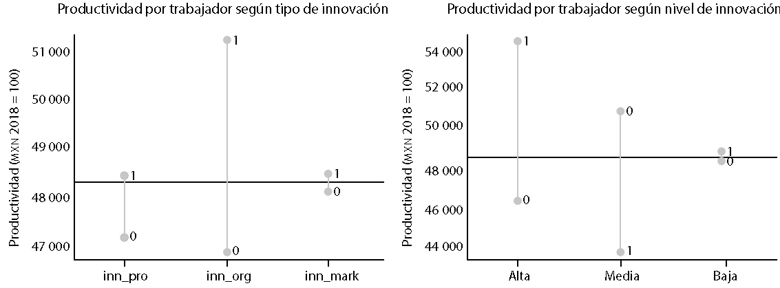 En las Gráficas de la 1 a la 4 se presentan las medias de productividad por trabajador según niveles de innovación y tipos, esto es, según su alto, medio o bajo nivel de innovación, así como el tipo de ella: de procesos (inn_pro), de organización (inn_org) y de mercadotecnia (inn_mark). Se observa que, excepto en el año 2020, los niveles de productividad alcanzados por las empresas que hicieron innovaciones de procesos y las clasificadas con altos niveles de innovación mostraron niveles más altos de productividad en comparación con la media, que se encuentra en la línea horizontal.