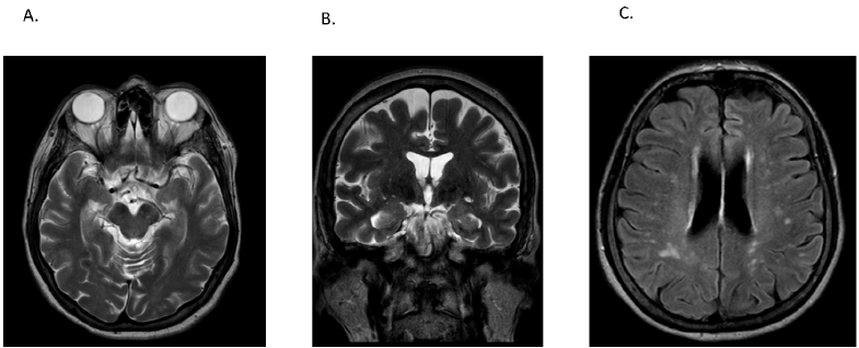Figura 1 Resonancia magnética cerebral. A) Corte axial en T2 sin evidencia de hiperintensidades a nivel temporal y sin alteraciones volumétricas apreciables. B) Corte coronal en T2 sin evidencia de hiperintensidades a nivel temporal. C) Corte axial en FLAIR con evidencia de múltiples hiperintensidades en sustancia blanca de predominio posterior Fazekas I.