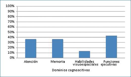 Al hacer un análisis cualitativo por caso, el 40% de los pacientes mostró deficiencias importantes en las habilidades cognoscitivas. En la tabla 5 se muestra que, al transformar las puntuaciones de la batería neuropsicológica a puntaje z, se encontró que el 30% de los participantes cumplió con criterios para ANI y el 10% cumplió criterios para MND. El 23.3% presentaba −1 DE y el 16.6% −2 DE por debajo de la media en dos o más áreas cognoscitivas. Respecto a la funcionalidad diaria, el 16.6% de los participantes presentaba afectación leve. Dichas puntuaciones bajas se observaron en atención, memoria, habilidades visuoespaciales y funciones ejecutivas. En la figura 1 se ilustran los porcentajes de deterioro cognoscitivo por dominio, basados en las puntuaciones z. Con respecto al estado de ánimo, el 83.3% de los pacientes presentó sintomatología depresiva, siendo el 23.3% leve, el 13.3% moderada, el 20% de moderada a grave y el 26.6% grave; y el 66.6% de los pacientes mostró sintomatología ansiosa, siendo el 20% leve, el 16.6% moderada y el 30% grave.