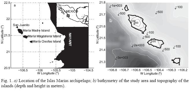 Islas Marías (Fig. 1) are of meteorological and oceanographic interest because they are relatively close to the coast of Nayarit to the east and at the edge of the continental shelf to the west. This latitude matches the point where the mainland coast abruptly changes its orientation. The islands are 130 km west of San Blas, Nayarit. The four islands of the archipelago are, from south to north, María Cleofas, María Magdalena, María Madre and San Juanito. The archipelago was protected by the Mexican government in 2000. Isla María Madre has served as federal prison since 1905. The other islands are unoccupied. The climate of the islands is dry and very warm with a markedly warm season precipitation regime. Mean annual temperature is 24.9 °C with an oscillation of 7.6 °C. The hottest month is July, while the coldest months are January and February. Mean annual precipitation is 564.2 mm. Northwest winds predominate in winter, while west and southwest winds predominate in summer. The arrival of hurricanes and tropical storms is common from September to October. CONANP (2007) provides more detailed information of the characteristics of the islands.