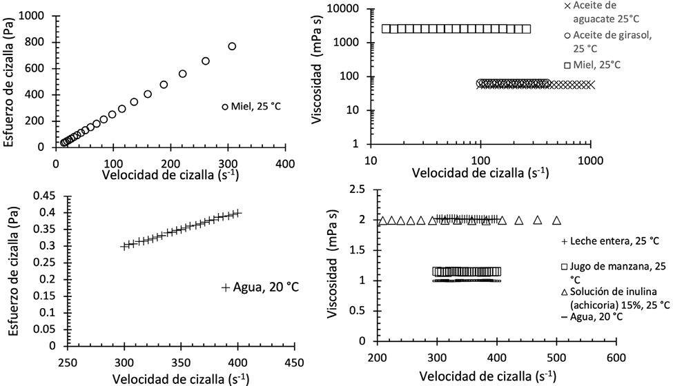 La viscosidad de los fluidos es una propiedad termo-dependiente por ello los ensayos se realizan a temperatura constante, la que se debe indicar en el reporte de resultados. En general, la viscosidad o la magnitud de algunos parámetros reológicos disminuyen al incrementar la temperatura. En la Figura 2, se muestran los resultados del agua purificada a 20 °C, aceite de aguacate y de girasol, leche, jugo de manzana, solución de inulina a 25 °C obtenidos en un reómetro de cono-placa y de la miel a 25 °C en cilindros concéntricos.