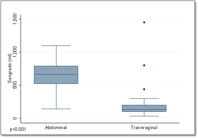 El sangrado (655.67 ml vs 216.33 ml, p<0.001), tiempo quirúrgico (262.40 min vs 165.33 min, p<0.001), tiempo de retiro Foley y OPEN (22.93 días vs 19.97 días, p=0.029), así como los días de estancia hospitalaria (7.97 días vs 2.53 días, p<0.001) fueron mayores en el grupo de técnica abdominal al compararla con la técnica transvaginal (ver tabla 2 y 3 y gráficas 1, 2, 3 y 4).