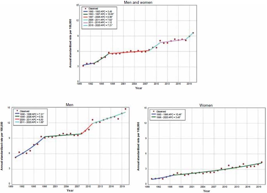 Figure 2 Standardized annual mortality from suicide in young people 15-24 years old, by sex. Mexico, 1990-2020.The annual percentage change (APC) is significantly different from zero at alpha = .05.