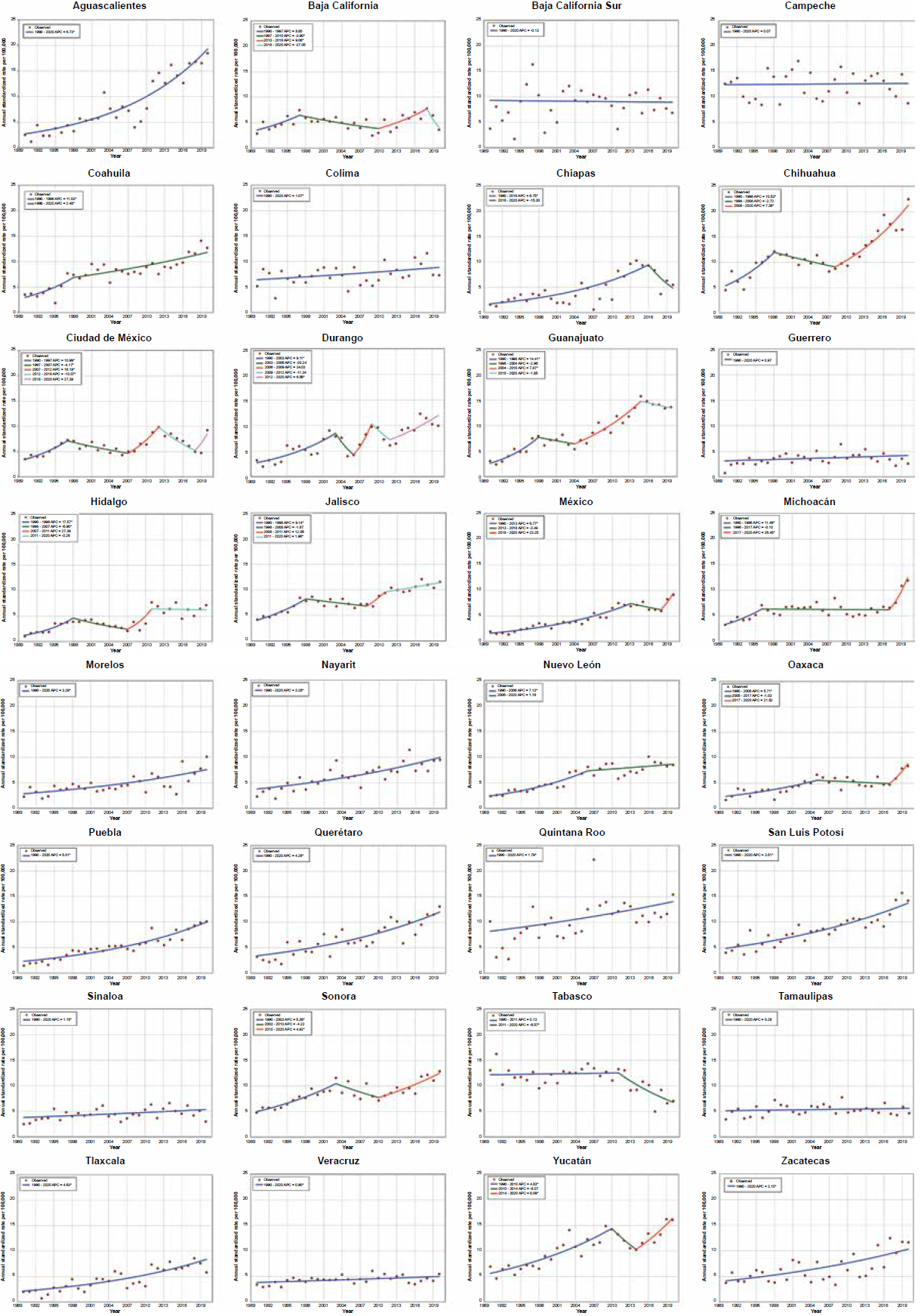 The Joinpoint segmented regression model was used for the time analysis of suicide mortality. Based on a log-linear model, it identifies the points where the direction or magnitude of the trend changes significantly, to determine whether a multisegmented line is statistically more useful for describing the time evolution of a set of data than a straight or less segmented line (Kim, Luo, Kim, Chen, & Feuer, 2014; Kim, Fay, Feuer, & Midthune, 2000). This model makes it possible to detect the points where significant changes occur in mortality trends (in other words, whether they remain stable, or increase or decrease) and also estimates the APC and AAPC (Annual Percentage Change and Average Annual Percentage Change) for each segment of the linear regression and the entire time series respectively as well as their 95% confidence intervals and level of significance (Torres-Sánchez, Rojas-Martínez, Escamilla-Núñez, de la Vara-Salazar, & Lazcano-Ponce, 2014). To select the model with the best data fit, the method using the sequence of permutation tests was used to guarantee that the approximate likelihood of a Type I error would be less than .05. This method involves conducting several tests to choose the number of points of union, using the Bonferroni correction for multiple tests (Kim et al., 2000). The analyses were conducted using Joinpoint v. 4.5.0.1 regression software (National Cancer Institute, 2016). For its graphic representation, the same mortality scale was used (with a rate of 0 to 15 deaths per sex and 0 to 25 deaths per 100,00 for the states).