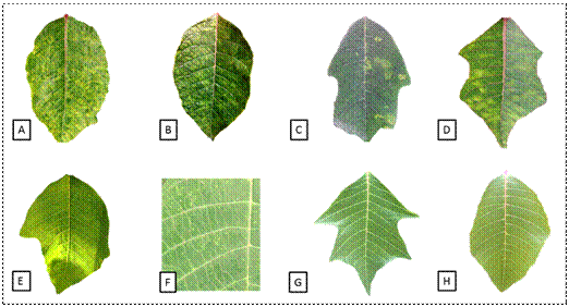 Figure 1 Leaves of wild poinsettia plants (Euphorbia pulcherrima) showing possible viral symptoms. Plant leaves kept in Chapingo Autonomous University's greenhouse. Mosaic (A y B), ringspots (C) and mottling (D). Leaves of plants collected in Jiutepec, Morelos. Deformation (E) and chlorotic spots (F). Asymptomatic leaves of plants collected in Tehuilotepec, Guerrero (G) and in Xilitla, San Luis Potosí (H).