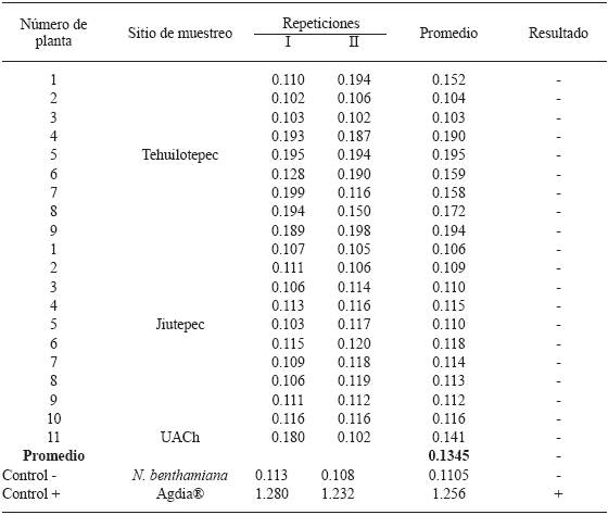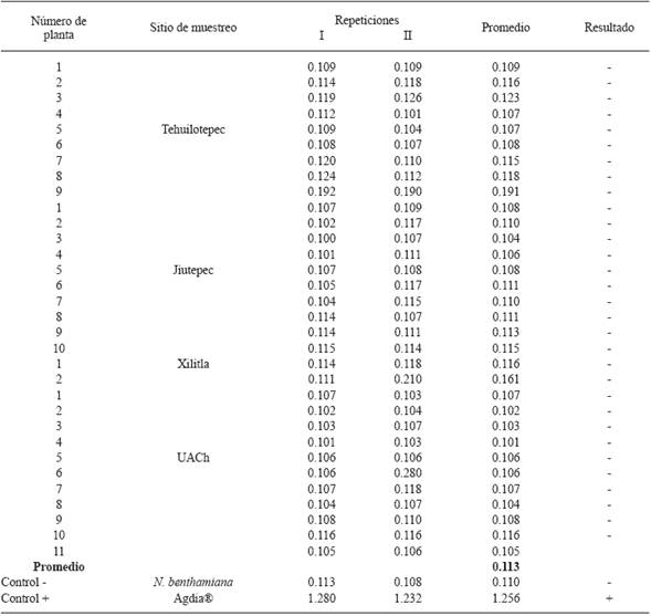 The PnMV was detected using DAS-ELISA in young leaves and roots of all the plants collected in Jiutepec and Tehuilotepec, and only foliar tissue from the UACh greenhouse and commercial plants (5 "Freedom" and 4 "Red Prestige" plants) was analyzed. The detection protocol was carried out following the manufacturer instructions (Reagent Set SRA 90700/0096 Agdia(r)). Absorbance values were measured after 60 min of incubation in an ELISA micro-plates reader (Multiskan EX, Labsystems) at 405 nm. Samples were considered positive when their absorbance values exceeded the average of the negative controls multiplied by 2 (García et al., 2014).