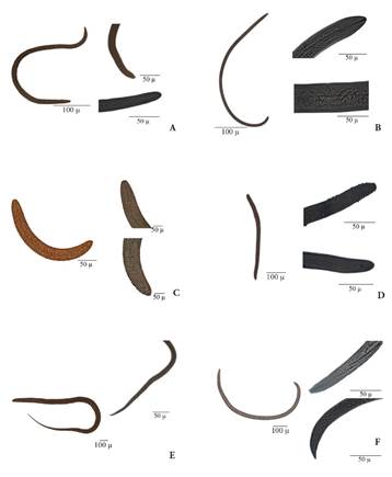 Figure 2. Distinctive morphological characteristics of genera of nematodes related to the lychee crop (Litchi chinensis) in commercial plantations in the state of Oaxaca, Mexico. A) Helicotylenchus, B) Hemicriconemoides, C) Pratylenchus, D) Psilenchus, E) Rotylenchus and F) Tylenchorhynchus.