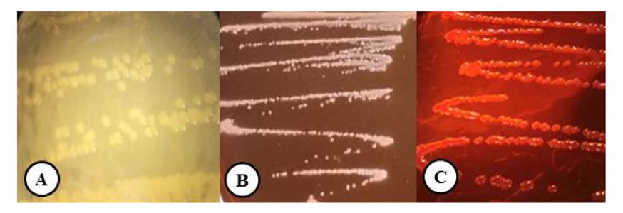 Figure 1 Growth of the B. gladioli bacterial isolation in King’s B culture medium (A), MacConkey’s Agar (B) and Congo Red (C) after 48 h of incubation.