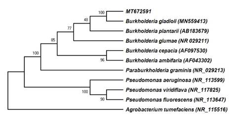 Phylogenetic tree. The consensus sequence MT672591 was grouped with B. gladioli (MN559413) with a similarity of 100 % (Figure 2).
