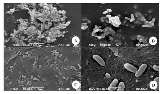 Figure 3 Micrography of B. gladioli (MT672591) observed with a scanning electron microscope. A and B correspond to biofilms (5,000 X and 10,000 X, respectively); C and D correspond to the bacteria in a planktonic state (5,000 and 20,000 X, respectively).