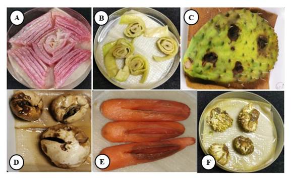 Figure 4 Symptoms of rotting caused by B. gladioli (MT672591) in different plant structures under controlled conditions: A) red onion bulbs, B) leek stalks, C) cactus cladodes, D) mushroom sporocarps, E) carrot roots and F) broccoli inflorescences.
