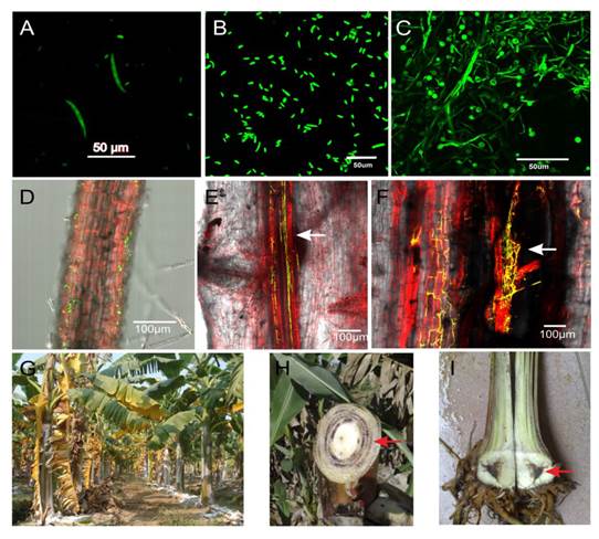 The genus Fusarium is the broadest and most important in the Tuberculareacea family, and from a taxonomical standpoint, it is one of the most difficult to handle out of all the fungus groups. This fungus covers numerous species and diverse special forms (f. sp.) within each species. On the other hand, it presents great variability and its identification in different species is imprecise (Dean et al., 2012). The perfect phase of F. oxysporum (FOX) is still unknown. However, the survival and proliferation of this species and is special forms depend on its asexual spores. FOC produces three types of asexual spores, including macroconidia, microconidia and chlamydospores in its life cycle (Figure 1 A-C), which help it spread and survive. In addition, it shares a similar infection cycle with Fusarium oxysporum f. sp. lycopercisi (FOL), the causal agent of wilt in tomato (Solanum lycopersicum) (Guo et al., 2014). Chlamydospores have thick walls, formed inside the hypha or the macroconidia, and can survive in the absence of the host for several years in a latent state, or they can germinate and grow as saprophytes in the remains of non-host plants to produce new chlamydospores (Nelson et al., 1983). FOC conidia germinate and form fungal hyphae under diverse nutritional and environmental conditions; the hyphae develop around the roots and colonize their surface. They then penetrate the epidermis, invade and colonize the xylem vessels of the root (Figure 1 D-F). After the process of infection in the banana plant roots, the fungus grows towards the rhizome and the pseudostem and causes the death of the tissue or of the entire plant. Between the initial infection by the fungus and the external symptoms, there is a moment in which the limbo of the leaves turns a bright yellow and it wilts or collapses around the pseudostem (Figure 1 G), whereas the vascular bundles of the pseudostem and of the rhizoma of the diseased plant turn reddish or maroon (Figure 1 H-I) (Guo et al., 2014).