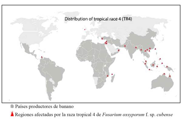 Scientific studies reported globally, related to the host-pathogen interaction of the binome Musa spp. and Fusarium oxysporum f. sp. cubense, indicate that the current and future tendency is the search for materials resistant to the pathogen via diverse biotechnology techniques, such as somaclonal variation, induced in vitro mutagenesis and genetic transformation itself, which are supported by methodologies for the early detection of resistance, with partially successful results thus far. Diverse work groups have been formed to face this phytopathological problem; those in Southeast Asia are particularly important, since it is where FOC RT4 was first detected, in 1990. In June of 2019, plants with FOC symptoms were observed in Colombia, only 19 years later. This was a warning for OIRSA member countries, including Mexico, and by July 25, 2019, the SADER-SENASICA (2019) claimed to be ready to prevent the entry of the fungus Fusarium oxysporum f. sp. cubense RT4 into the country, and reinforced security and prevention measures to mitigate the risk of its entry. It also made a priority out of training technicians and farmers, in which epidemiological surveillance was crucial. Regarding scientific research to face the problem that draws near, little progress has been made in Mexico. It is therefore crucial for research-focused institutions to address this problem.