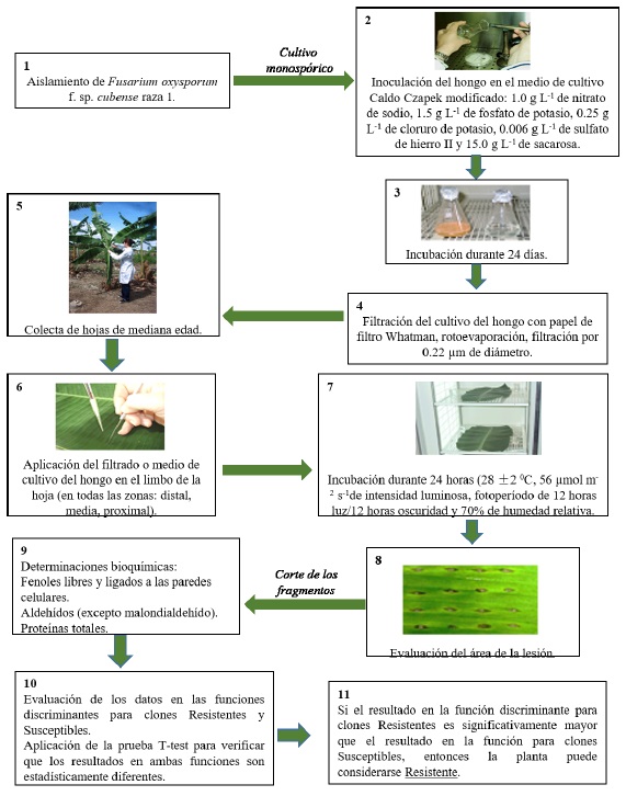 This estimation was carried out using a data matrix that included the effect of the FCH (area of the lesion and levels of phenols, both free and linked to the cell walls, aldehydes except malondialdehyde, and proteins) on the leaves of 18 cultivars. After the discriminant analysis, two functions were obtained; one for resistant cultivars and the other for susceptible ones. Each plant of the matrix was evaluated according to discriminant functions and classified as resistant or susceptible for 94.4% of all cases (68 plants out of 72). The described method is a useful tool to increase the efficiency of the selection under ex vitro and in vivo conditions, regardless of environmental conditions or the favorable season for the development of the disease. It also helps evaluate an important number of samples in the laboratory and to speed up the genetic breeding programs for this disease. For this reason, García et al. (2020) proved that the method to differentiate the susceptibility or resistance to Fusarium described earlier can be carried out quickly and in a non-destructive way with the use of treated FCH on the leaves for different populations of the pathogens. This could be applicable to the genetic breeding programs for musaceae, both conventional and biotechnological. On the other hand, they lay the foundations for future projects related to the identification of the specificity of alleged avirulence genes of the causal agent. In this regard, Portal et al. (2018) studied the toxic components of FCH of race 1 of FOC GCV [01210] using the bioassay described by Companioni et al. (2003) and they isolated the extracellular microbial metabolites implied in the response of the plant. In the latter, they obtained a culture filtrate of the specific host and they characterized the phytotoxic compounds such as fusaric acid, bovericin and fumonisin B1. These results are the basis for the direct isolation of avirulence genes of the pathogen and genes for the resistance in banana plants via advanced genetics for use in genetic breeding programs for the crop.