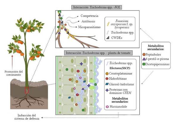 Algunas especies de Trichoderma spp. interaccionan benéficamente con la planta de jitomate (Solanum lycopersicum), favoreciendo su desarrollo y activando su sistema de defensa contra diversos fitopatógenos. Cada interacción está mediada por metabolitos y genes expresados diferencialmente y se puede deducir que las proteínas codificadas por estos, también llamadas efectores permiten establecer estas relaciones (Ramirez-Valdespino et al., 2019).