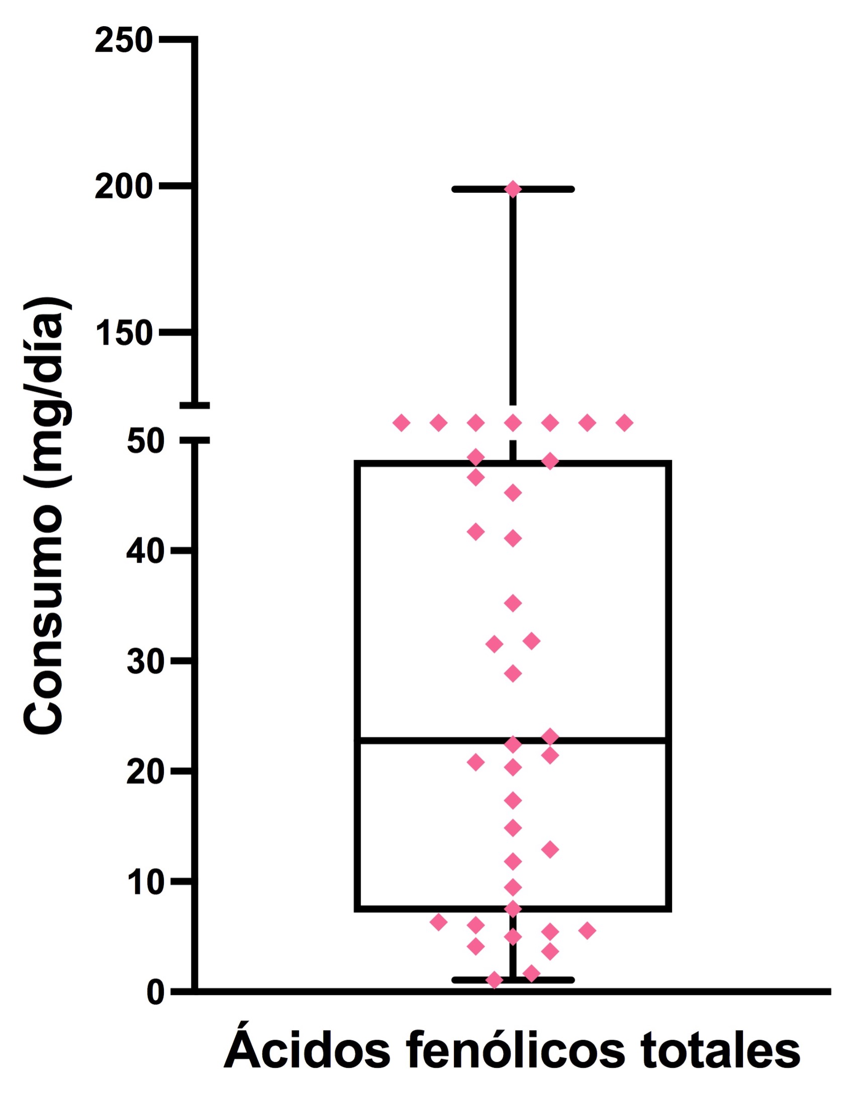 Figura 4 Consumo de ácidos fenólicos totales (mg/día). Los datos (rombos rosados) representan el consumo individual (n = 38), así como la distribución de la población (mínimo, máximo, mediana, primer y tercer cuartil), según lo reportado en el recordatorio dietético de 24 horas.