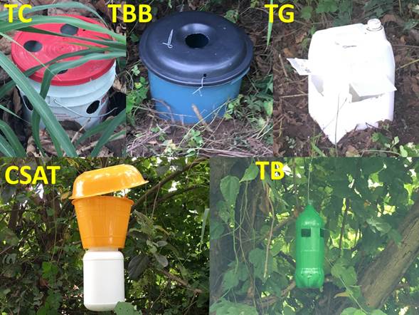 En el huerto con ‘Alto Pacífico ecotipo 2’, la eficiencia de las trampas para la captura masiva de adultos de R. palmarum se evaluó con cinco tipos de trampas con seis repeticiones cada una (Figura 1). Los diseños se establecieron con base en la literatura científica: tipo cubeta (Murguía-González et al., 2017), bote de basura (Ramos et al., 2017), tipo galón (Moya-Murillo, Aldana-De la Torre, & Bustillo-Pardey, 2015; Rodríguez-Currea et al., 2017), trampa CSAT (Colegio Superior de Agricultura Tropical, Tabasco, México) y tipo botella (Murguía-González et al., 2017). Las trampas se colocaron en el perímetro de la huerta a 100 m una de la otra y se distribuyeron al azar. En cada trampa se utilizaron trozos de caña de azúcar (200 g) y melaza (100 mL) como cebo alimenticio que se reemplazó cada 15 días y una cápsula de Rhynchophorol (Pherocon®) como feromona de agregación que se sustituyó cada tres meses durante el año de muestreo. Los insectos se recolectaron cada semana iniciando en agosto del 2018 y finalizando el mismo mes del 2019. Se registró la captura total de insectos, así como el número de hembras y machos.