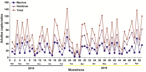 En AP se capturaron 3 414 insectos. La TBB y CSAT fueron las más efectivas (P < 0.014) con 40.3 % y 32.7 % del total de adultos, respectivamente; además tuvieron el mejor costo-beneficio, 4.3 MXN y 5.5 MXN por insecto respectivamente. En EVB se capturaron 3.56 veces más insectos (4 799) que en AP con relación 29.6:6.4, utilizando TG. En ambas huertas, las correlaciones de las variables climáticas con la captura fueron débiles (menores de 50 %); la humedad relativa fue la de mayor correlación, pero negativa.