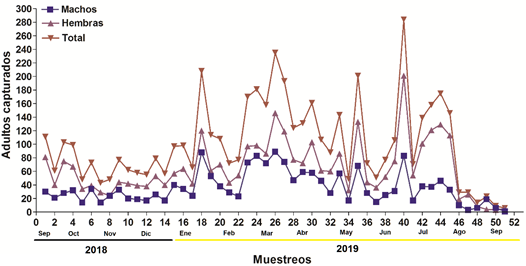 Figura 3 Fluctuación de captura de Rhynchophorus palmarum con trampas tipo galón durante un año en una huerta de coco con el genotipo ‘Enano Verde de Brasil” en Caleras, Tecomán, Colima, México.