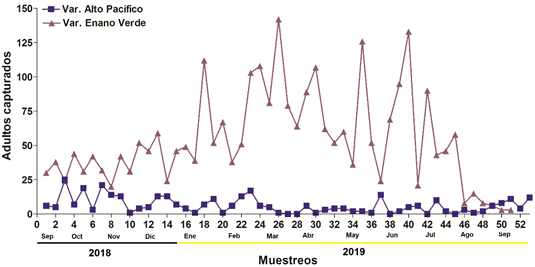En la huerta del híbrido ‘Enano Verde de Brasil’, la fluctuación poblacional de captura de R. palmarum y su correlación con las variables climáticas se analizó con datos de 20 trampas tipo galón durante un año. Este tipo de trampa, debido a su fácil elaboración, es la más utilizada por los productores de coco en la región. La captura de adultos de R. palmarum en ‘Alto Pacífico ecotipo 2’ y ‘Enano Verde de Brasil’ se compararon a partir de los datos de seis trampas tipo galón de cada huerta. Cada trampa se consideró como una réplica. Se recopilaron datos de captura durante 52 semanas y se registró la captura total de insectos y número de hembras y machos.