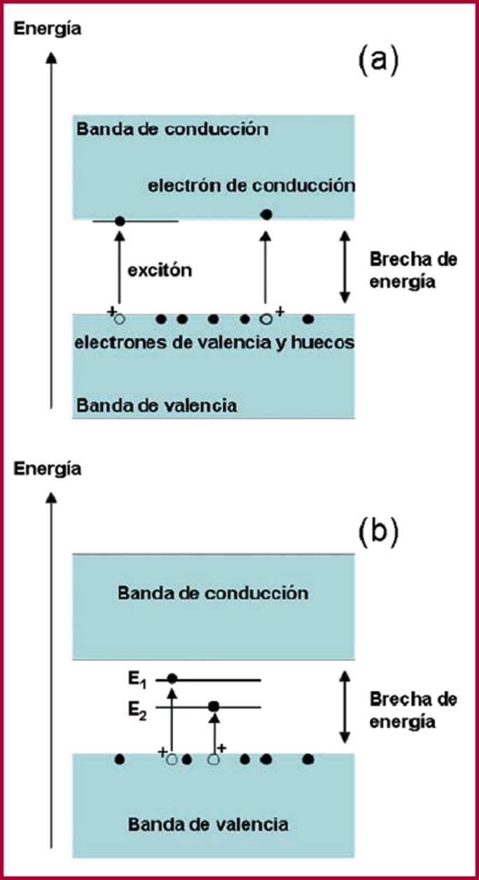 La energía que los electrones de valencia pueden adquirir durante una excitación, o relajamiento, usualmente se esquematiza en lo que se conoce como estructura de bandas (Figura 3a). La banda de valencia representa los valores de la energía de los electrones de valencia. La banda de conducción representa los valores de la energía que puede adquirir un electrón de valencia una vez que se convierte en un electrón libre, o de conducción. La brecha de energía se representa como una región prohibida (vacía), entre las bandas de valencia y conducción, para indicar que un electrón excitado o relajado no puede adquirir los valores de energía intermedios. La brecha de energía de los semiconductores surge por razones de la geometría del ordenamiento atómico, y por el tipo de orbitales de valencia que posee (Sutton, 1996: 101). Sin embargo, hay casos como el que se muestra en la Figura 3b, donde observamos dos líneas de energía en la región prohibida de un semiconductor. Esta estructura de bandas indica que sus electrones de valencia pueden adquirir los valores de energía E1 y E2 mientras ascienden a la banda de conducción, o cuando regresan a su banda de valencia. Estas líneas de energía aparecen en una brecha prohibida cuando los semiconductores poseen defectos cristalinos o impurezas atómicas.