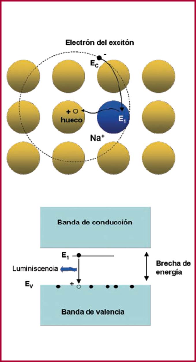 Los defectos cristalinos y las impurezas de los semiconductores actúan como verdaderas trampas en el movimiento de los electrones. En la Figura 4 se muestra, por ejemplo, a una impureza de un átomo ionizable de Sodio+ (Na+), atrapando al electrón de excitón. El electrón atrapado adquiere la energía E1, que es menor que la que poseía como electrón de excitón (Figura 4a). Si el electrón de valencia atrapado por el ión Na+ es liberado, entonces se recombinará con un hueco, de carga positiva, para convertirse nuevamente en un electrón de valencia con energía Ev, perdiendo una energía (E1 - Ev) en forma de luminiscencia. Es claro que esta luminiscencia será de menor energía (de otro color) que la luminiscencia generada por una transición del electrón desde la banda de conducción hasta la banda de valencia.