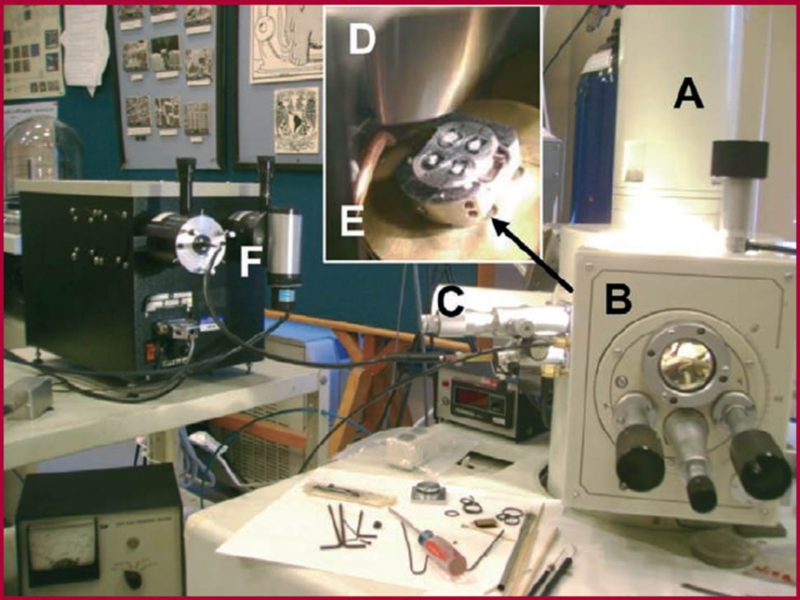 Figura 5 Microscopio electrónico de barrido compuesto por una columna que enfoca el haz de electrones (a), cámara de análisis de la muestra (b), detector de electrones (centellador) (c), parte inferior de la columna y porta muestras, fibra óptica detector colector de la CL (d), y detector de luminiscencia tipo fotomultiplicador.